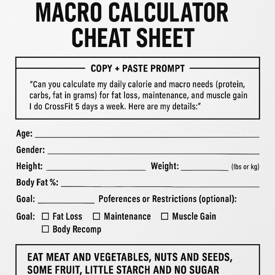 ![]() Awesome! Here's a clean, printable cheat sheet version of the macro prompt your members can fill in and use with any AI (like ChatGPT) to get deficit, maintenance, and surplus macros based on their CrossFit training: ๐๏ธโโ๏ธ CrossFit Macro Calculator Prompt Use this prompt to get personalized macro goals for Fat Loss, Maintenance, and Muscle Gain. ๐ INSTRUCTIONS: Copy and paste this text into ChatGPT or your preferred AI tool, then fill in your details. ๐ป PROMPT: โCan you calculate my daily calorie and macro needs (protein, carbs, fat in grams) for fat loss, maintenance, and muscle gain? I do CrossFit 5 days a week. Here are my details:โ Age: _______ Gender: _______ Height: _______ (feet/inches or cm) Weight: _______ (lbs or kg) Estimated Body Fat % (if known): _______ Activity level: CrossFit 5x/week Goal: (circle one) โ Fat Loss โ Maintenance โ Muscle Gain โ Body Recomp Dietary Preferences or Restrictions (optional): ___________________________ โPlease give me daily calories and macros for:โ โ Fat Loss (Deficit) โ Maintenance โ Muscle Gain (Surplus) |